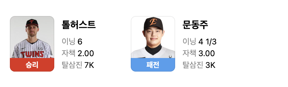 | 문동주 (한화) | 4⅓이닝 | 4안타 | 3K | 4실점 | 패전투수 |