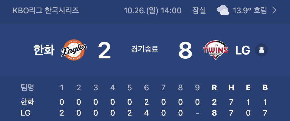 결과는 LG의 8-2 완승. 이 승리로 LG는 통계적으로 시리즈 우승 확률 73.2%를 확보했습니다. 한화는 2006년 이후 19년 만에 도전한 한국시리즈의 첫 경기에서 아쉬움을 남겼습니다.