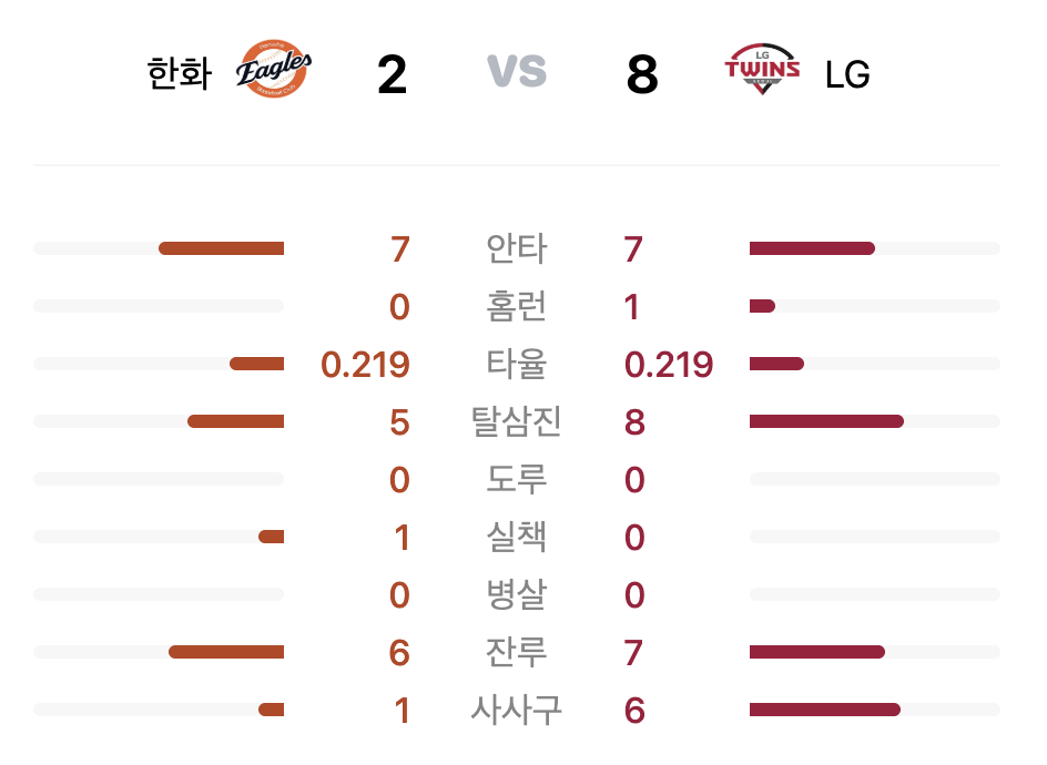 | 한화 이글스 | 2 | 8 | 0 | 2 |