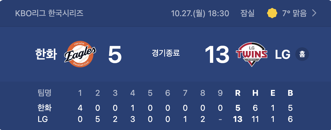 2025년 10월 27일 잠실야구장에서 열린 한국시리즈 2차전, LG 트윈스는 1회 4점을 먼저 내줬지만 2회부터 맹렬한 추격을 시작해 한화 이글스를 13-5로 꺾었습니다.